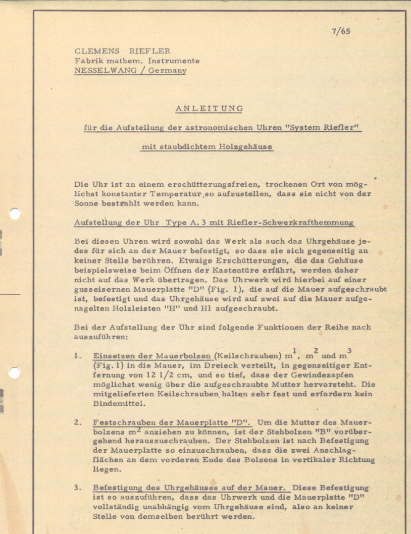 Bedienungsanleitung der Riefler Nr. 711 im Original